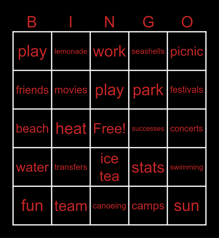 This bingo card has a free space and 24 words: fun, transfers, play, camps, picnic, play, lemonade, work, successes, concerts, beach, movies, stats, swimming, friends, team, canoeing, seashells, festivals, water, heat, ice tea, park and sun.