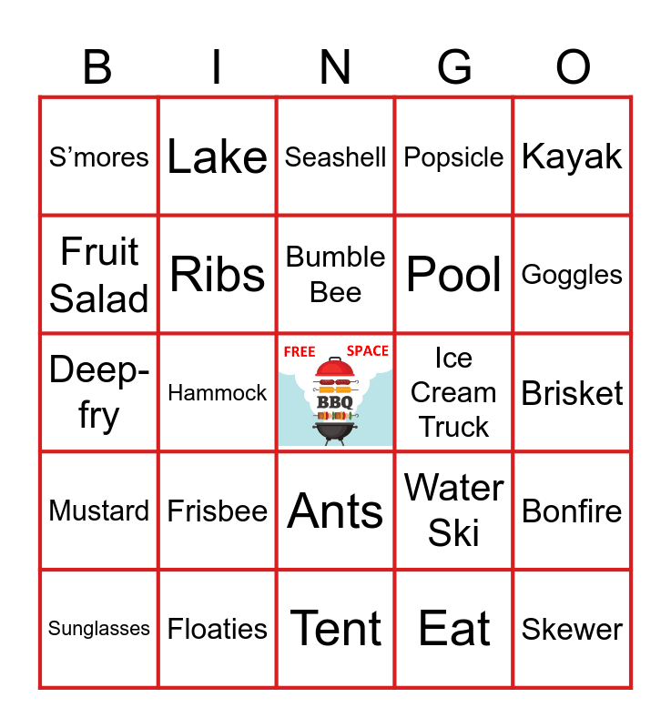 This bingo card has a free space and 86 words: Air Conditioner, Allergies, Ants, Backyard, Baseball, Bathing Suit, BBQ, BBQ sauce, Beach, Beachball, Boardwalk, Boating, Bonfire, Brisket, Bug Spray, Bumble Bee, Burgers, Butterflies, Camping, Chicken, Chips, Cooler, Deep-fry, Dinner, Eat, Family, Family Reunion, Fireflies, Fireworks, Fishing, Floaties, Flowers, Friends, Frisbee, Fruit Salad, Gardening, Goggles, Grasshoppers, Grill, Hammock, Heat, Hot Dogs, Humidity, Ice Cream Truck, Italian Ice, Kayak, Ketchup, Lake, Lemonade, Macaroni salad, Mosquitoes, Music, Mustard, Palm Tree, Pasta Salad, Patio, Picnic, Pool, Popsicle, Ribs, S’mores, Sailboat, Sandals, Sandcastle, Sangria, Seashell, Shorts, Skewer, Smores, Snorkeling, Spatula, Sun Block, Sunglasses, Sunscreen, Sunshine, Surfing, Tent, Tongs, Towel, UV Index, Vacation, Volleyball, Water, Water Balloons, Water Ski and Watermelon.