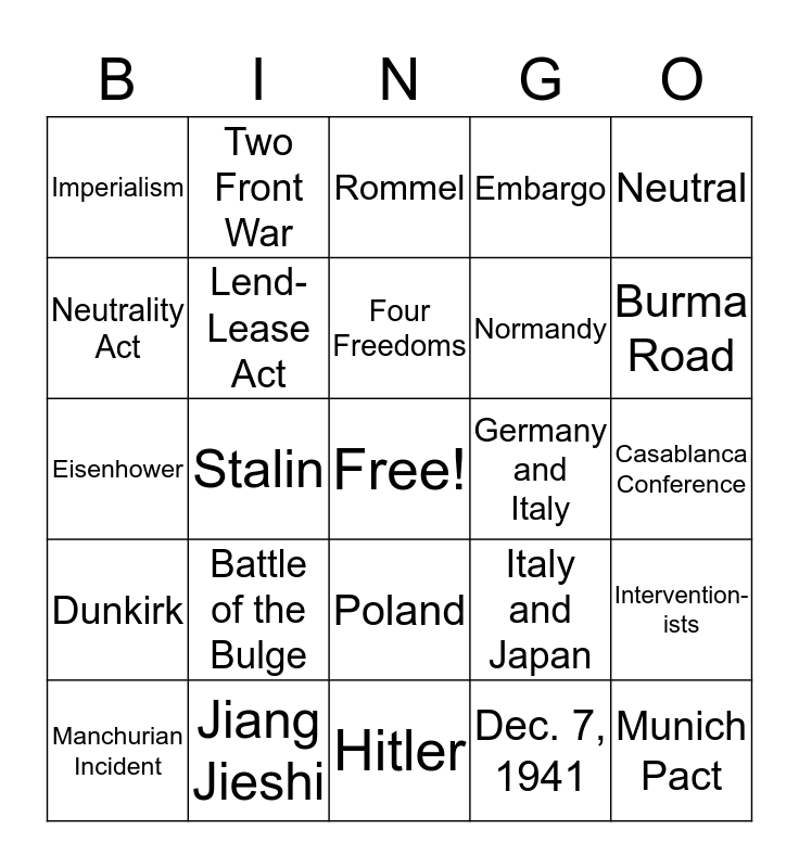 This bingo card has a free space and 49 words: Great Depression, Munich Pact, Stalingrad, Hitler, Battle of the Bulge, Japan, Two Front War, Appease-ment, Neutrality Act, Isolationists, Lend-Lease Act, Embargo, Intervention-ists, Italy and Japan, Mein Kampf, League of Nations, Four Freedoms, Germany and Italy, Pearl Harbor, Neutral, Stalin, Dec. 7, 1941, Imperialism, Normandy, Non-aggression Pact, Burma Road, Manchurian Incident, Lebensraum, Poland, Dunkirk, Blitzkrieg, Battle of Britain, Winston Churchill, Natural Resources, Jiang Jieshi, Mao Zedong, Axis, Tojo, Casablanca Conference, Italy, D-Day, Germany, V-E Day, June 6, 1944, Eisenhower, Rommel, Anschluss, Sudentland and Atlantic Charter.