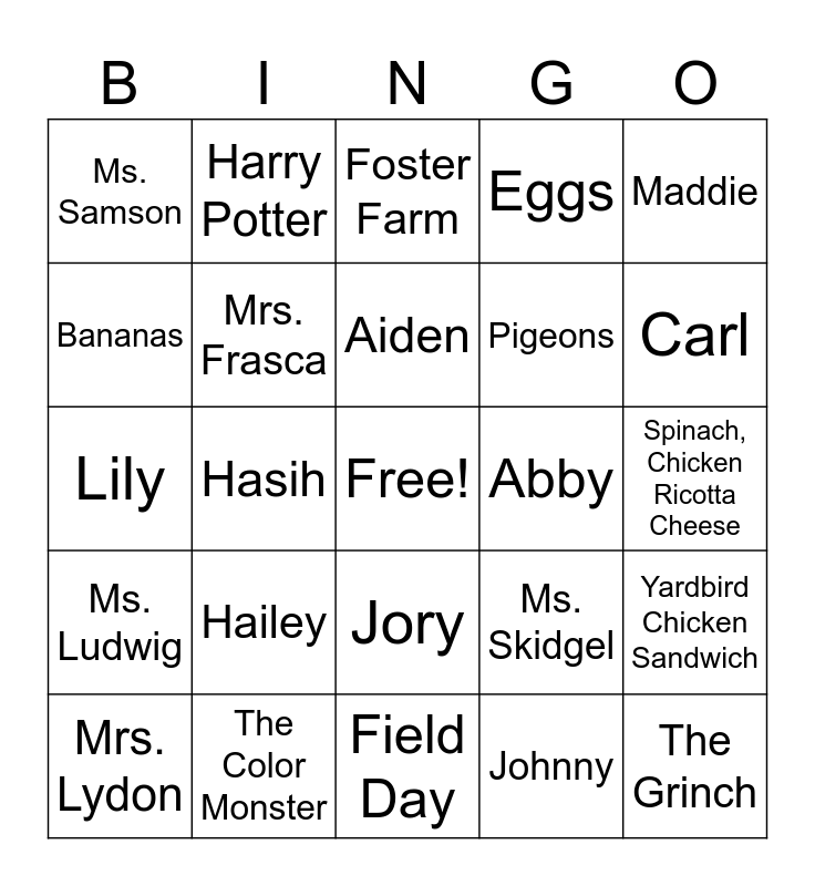 This bingo card has a free space and 24 words: Hailey, The Color Monster, Aiden, Mrs. Lydon, Maddie, Ms. Samson, Bananas, Harry Potter, Abby, Jory, Pigeons, Lily, Ms. Skidgel, Yardbird Chicken Sandwich, Mrs. Frasca, Johnny, Spinach, Chicken Ricotta Cheese, Foster Farm, Carl, Hasih, The Grinch, Ms. Ludwig, Eggs and Field Day.