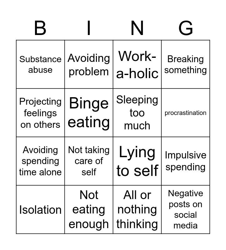 This bingo card has 16 words: Not eating enough, Impulsive spending, Work-a-holic, Substance abuse, Avoiding spending time alone, Avoiding problem, Lying to self, All or nothing thinking, Projecting feelings on others, Binge eating, Isolation, Breaking something, Not taking care of self, procrastination, Sleeping too much and Negative posts on social media.