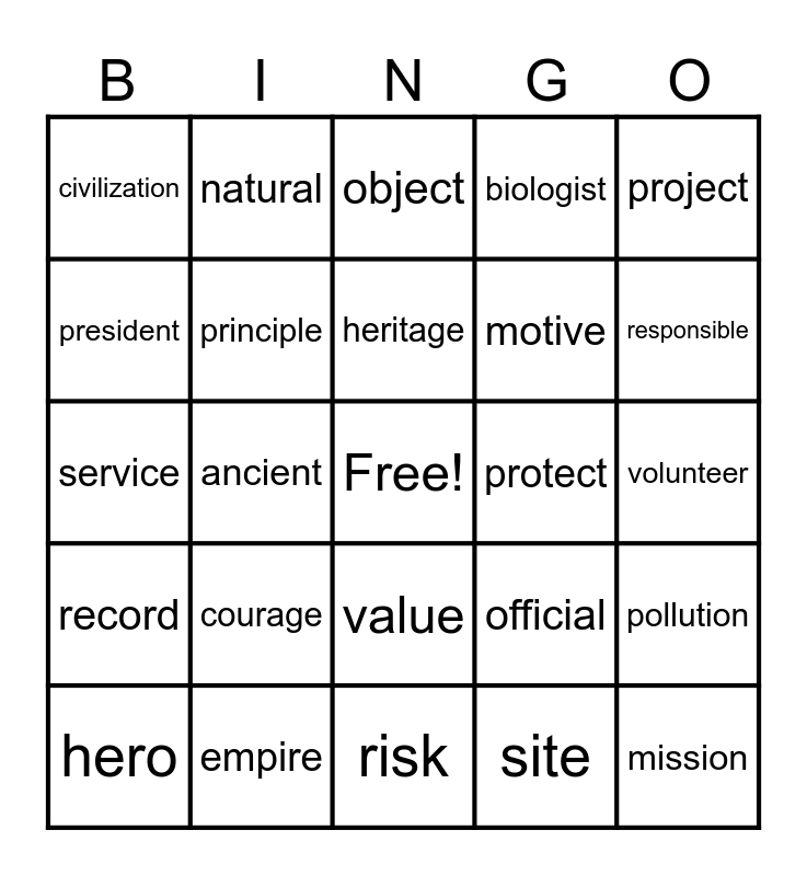 This bingo card has a free space and 24 words: courage, empire, heritage, hero, project, civilization, president, natural, protect, value, motive, service, official, pollution, principle, site, volunteer, object, responsible, ancient, mission, record, biologist and risk.