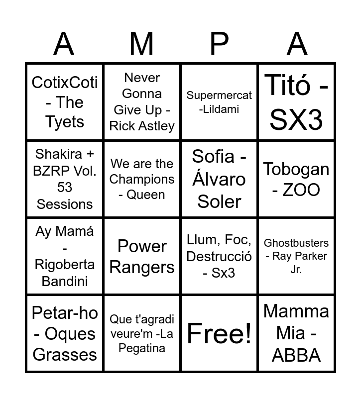This bingo card has 17 words: Free!, Petar-ho - Oques Grasses, Supermercat -Lildami, CotixCoti - The Tyets, Power Rangers, Titó - SX3, Ghostbusters - Ray Parker Jr., Sofia - Álvaro Soler, Tobogan - ZOO, We are the Champions - Queen, Que t'agradi veure'm -La Pegatina, Llum, Foc, Destrucció - Sx3, Shakira + BZRP Vol. 53 Sessions, Never Gonna Give Up - Rick Astley, Ay Mamá - Rigoberta Bandini, It's my life - Bon Jovi and Mamma Mia - ABBA.