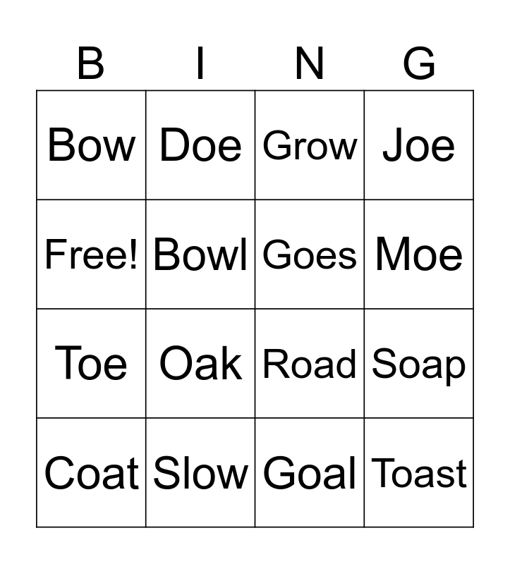 This bingo card has 16 words: Slow, Soap, Grow, Bow, Toe, Doe, Road, Goal, Free!, Bowl, Coat, Joe, Oak, Moe, Goes and Toast.