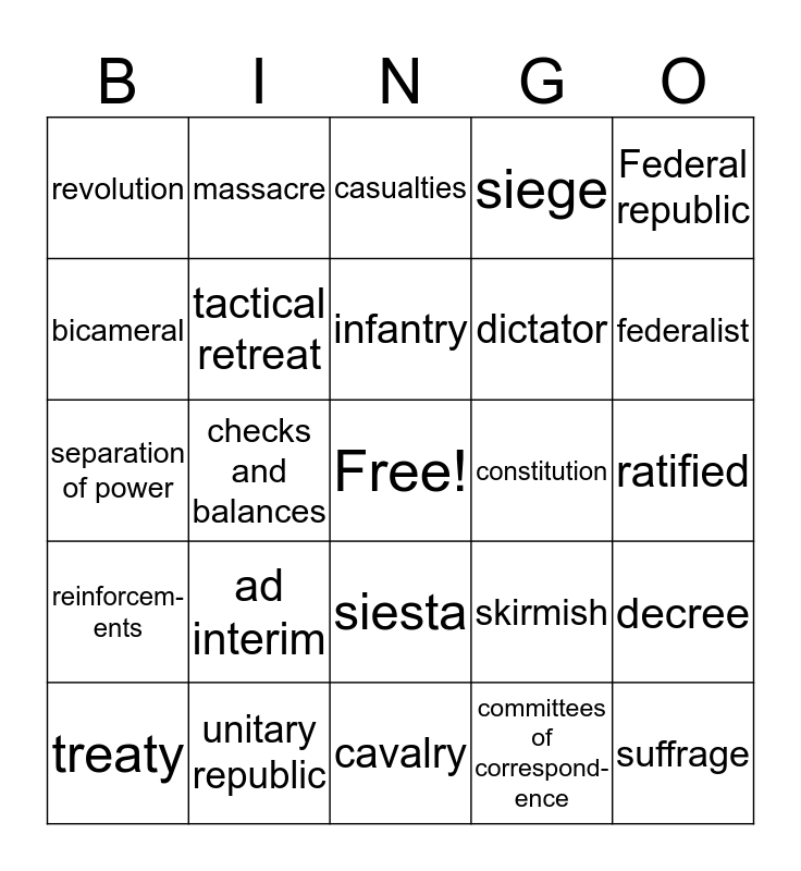 This bingo card has a free space and 24 words: ad interim, unitary republic, infantry, treaty, Federal republic, revolution, bicameral, massacre, constitution, siesta, dictator, separation of power, skirmish, decree, tactical retreat, committees of correspond-ence, ratified, casualties, federalist, checks and balances, suffrage, reinforcem-ents, siege and cavalry.