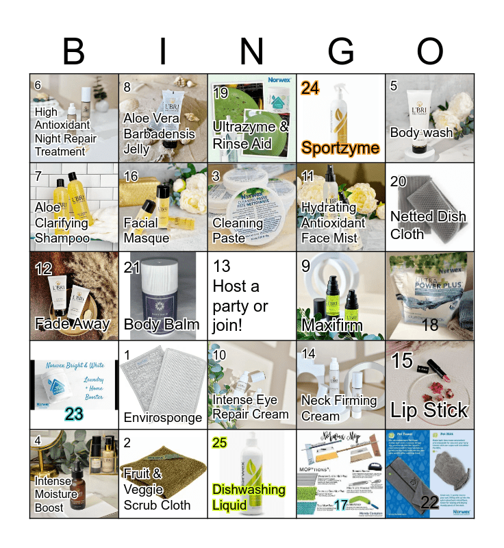 This bingo card has 24 images, a free space and 24 words: 1 Envirosponge, 2 Fruit & Veggie Scrub Cloth, 3 Cleaning Paste, 4 Intense Moisture Boost, 5 Body wash, 6 High Antioxidant Night Repair Treatment, 7 Aloe Clarifying Shampoo, 8 Aloe Vera Barbadensis Jelly, 9 Maxifirm, 10 Intense Eye Repair Cream, 11 Hydrating Antioxidant Face Mist, 12 Fade Away, 14 Neck Firming Cream, 15 Lip Stick, 16 Facial Masque, 17, 18, 19 Ultrazyme & Rinse Aid, 20 Netted Dish Cloth, 21 Body Balm, 22, 23, 24 Sportzyme and 25 Dishwashing Liquid.