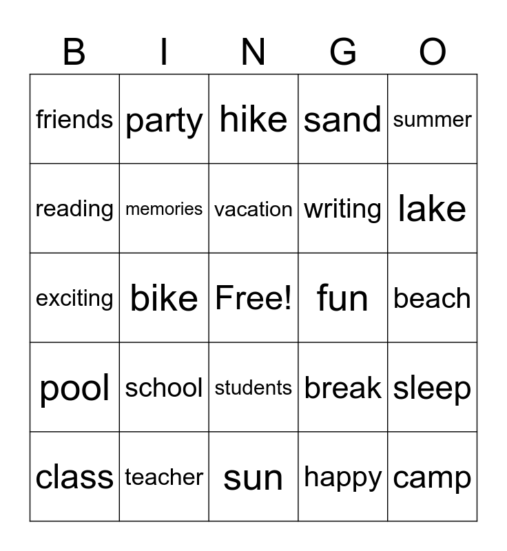 This bingo card has a free space and 24 words: school, teacher, vacation, class, summer, friends, reading, party, fun, students, writing, exciting, break, sleep, memories, happy, beach, hike, lake, bike, camp, pool, sand and sun.
