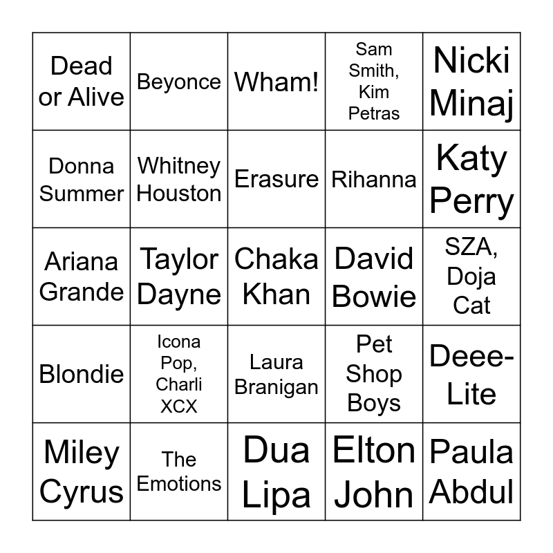 This bingo card has 49 words: Diana Ross, Chaka Khan, Robyn, Dua Lipa, Icona Pop, Charli XCX, Ava Max, Beyonce, Janelle Monae, Donna Summer, CHIC, Whitney Houston, Sam Smith, Kim Petras, Deee-Lite, Pet Shop Boys, Tegan and Sara, Queen, Erasure, David Bowie, Gloria Gaynor, Nicki Minaj, Taylor Dayne, Elton John, Dead or Alive, Rihanna, P!nk, Katy Perry, Miley Cyrus, Spice Girls, Laura Branigan, Blondie, R.E.M., Adam Lambert, Cyndi Lauper, KC & The Sunshine Band, The Emotions, Britney Spears, Lil Nas X, Tina Turner, SZA, Doja Cat, Latto, Big Freedia, Lizzo, Macklemore, Paula Abdul, Lady Gaga, Ariana Grande, Wham!, Janet Jackson, Daft Punk and Shania Twain.