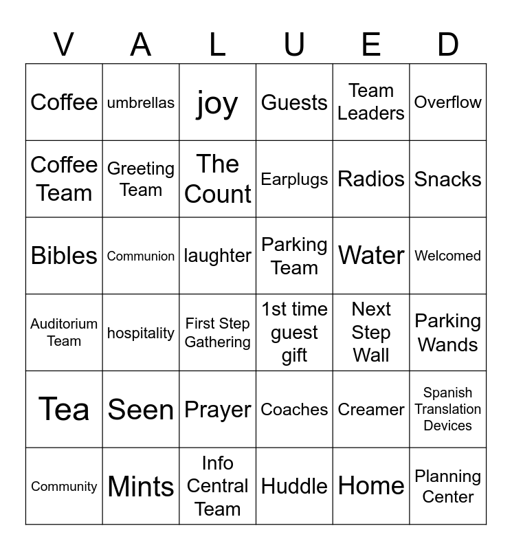 This bingo card has 36 words: Coaches, Prayer, Huddle, Coffee Team, Auditorium Team, Parking Team, Greeting Team, Info Central Team, Team Leaders, Creamer, Snacks, Guests, Spanish Translation Devices, Communion, Earplugs, Coffee, Tea, Water, Bibles, joy, laughter, hospitality, 1st time guest gift, First Step Gathering, Next Step Wall, umbrellas, Radios, Mints, The Count, Overflow, Planning Center, Community, Parking Wands, Welcomed, Seen and Home.