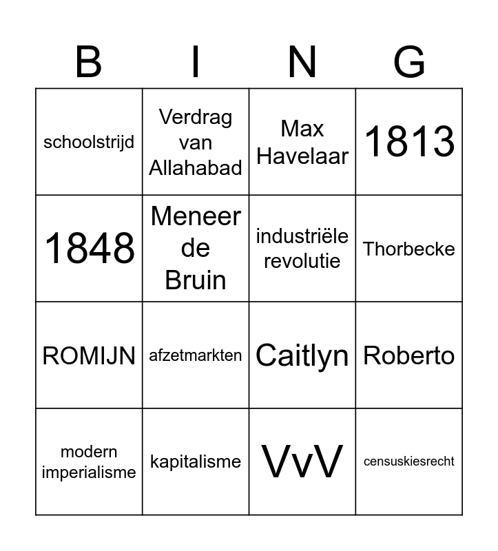 This bingo card has 58 words: Congres van Wenen, proletariaat, Karl Marx, censuskiesrecht, liberalisme, huisnijverheid, industriële revolutie, grondstoffen, ROMIJN, communisme, 1813, sociaal democraten, Mevrouw Romijn, Restauratie, Conferentie van Berlijn, schoolstrijd, modern imperialisme, 1848, Pacificatie, Thorbecke, kapitalisme, Max Havelaar, confessionelen, sociale kwestie, heilstaat, VvV, superioriteitsgevoel, nationalisme, afzetmarkten, Rayshen, Charlotte, Jilo, Fenna, Jelvin, Ali, Tasos, Coen, Roberto, Caitlyn, Splinter, Maud, Celine, Yair, Glenn, Tim, Marijn, Luna, Gijs, Marco, Noortje, Onne, 315, HB Britse Rijk, Grote Indiase opstand, Verdrag van Allahabad, Pilgrim Fathers, Meneer de Bruin and Mevrouw Romijn.