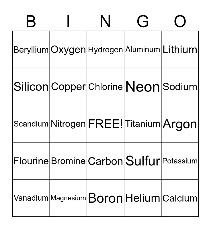 This bingo card has a free space and 24 words: Bromine, Magnesium, Chlorine, Vanadium, Lithium, Beryllium, Silicon, Oxygen, Titanium, Carbon, Neon, Scandium, Sulfur, Potassium, Copper, Helium, Argon, Hydrogen, Sodium, Nitrogen, Calcium, Flourine, Aluminum and Boron.