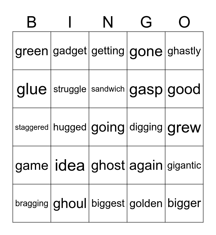This bingo card has 25 words: idea, biggest, sandwich, bragging, ghastly, green, glue, gadget, digging, ghost, gasp, staggered, again, gigantic, struggle, bigger, grew, getting, good, hugged, going, ghoul, game, gone and golden.