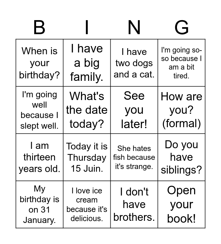 This bingo card has 16 words: I love ice cream because it's delicious., Do you have siblings?, I have two dogs and a cat., When is your birthday?, I am thirteen years old., I have a big family., She hates fish because it's strange., I don't have brothers., I'm going well because I slept well., What's the date today?, My birthday is on 31 January., I'm going so-so because I am a bit tired., Today it is Thursday 15 Juin., How are you? (formal), See you later! and Open your book!.