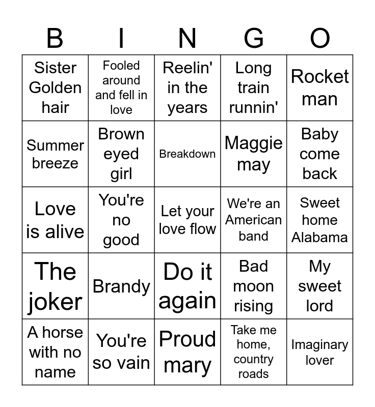 This bingo card has 30 words: You're so vain, American pie, You're no good, Sundown, Sister Golden hair, Reelin' in the years, Brown eyed girl, Do it again, We're an American band, Proud mary, Sweet home Alabama, Let your love flow, Take me home, country roads, Imaginary lover, Baby come back, Midnight rider, Bad moon rising, The joker, Brandy, Rocket man, Love is alive, Rhiannon, Fooled around and fell in love, Maggie may, Summer breeze, Long train runnin', My sweet lord, A horse with no name, Breakdown and Beast of burden.