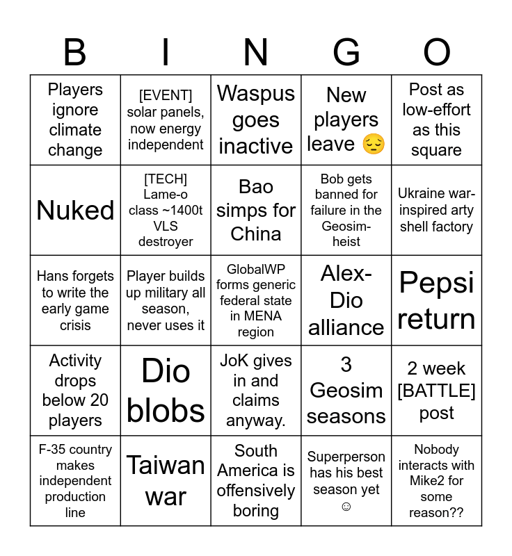 This bingo card has a free space and 24 words: Dio blobs, Taiwan war, Bao simps for China, F-35 country makes independent production line, Post as low-effort as this square, Players ignore climate change, Nuked, [EVENT] solar panels, now energy independent, Alex-Dio alliance, JoK gives in and claims anyway., Bob gets banned for failure in the Geosim-heist, Hans forgets to write the early game crisis, 3 Geosim seasons, 2 week [BATTLE] post, [TECH] Lame-o class ~1400t VLS destroyer, Superperson has his best season yet ☺️, Pepsi return, Waspus goes inactive, Ukraine war-inspired arty shell factory, Player builds up military all season, never uses it, Nobody interacts with Mike2 for some reason??, Activity drops below 20 players, New players leave 😔 and South America is offensively boring.