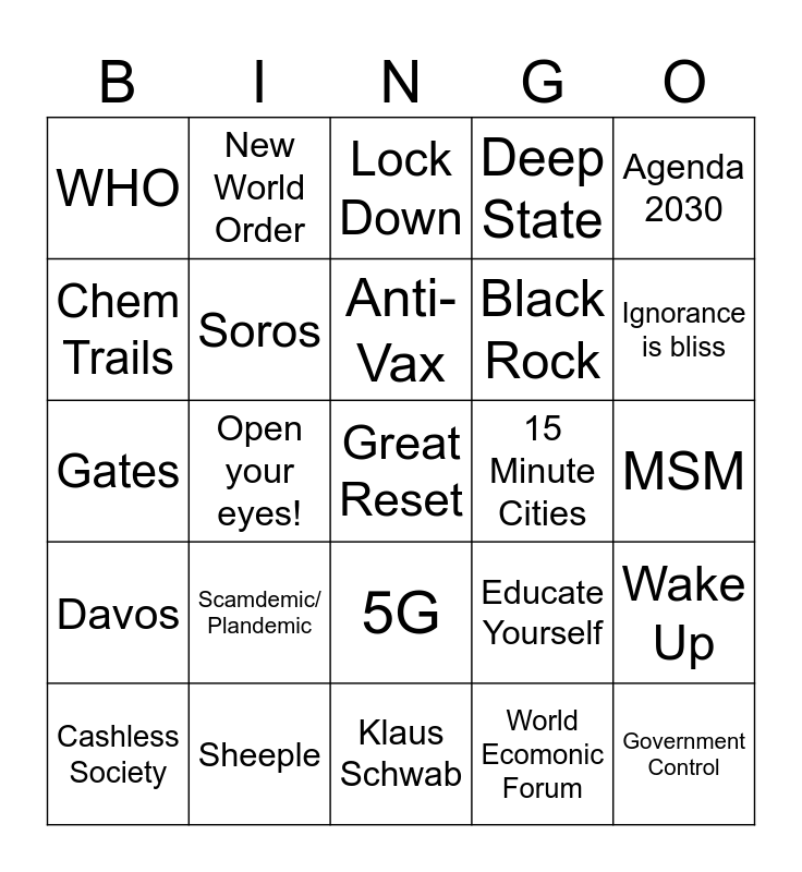 This bingo card has a free space and 24 words: Scamdemic/ Plandemic, Sheeple, Anti-Vax, Cashless Society, Agenda 2030, WHO, Chem Trails, New World Order, 15 Minute Cities, 5G, Black Rock, Gates, Educate Yourself, Wake Up, Soros, World Ecomonic Forum, MSM, Lock Down, Ignorance is bliss, Open your eyes!, Government Control, Davos, Deep State and Klaus Schwab.