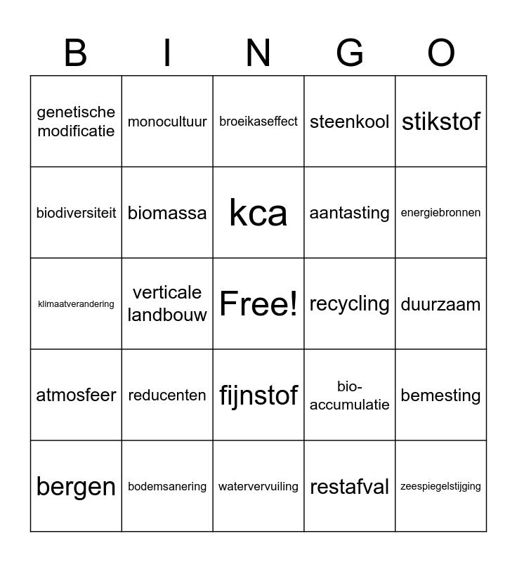 This bingo card has a free space and 26 words: fijnstof, restafval, kca, bodemsanering, stikstof, genetische modificatie, biodiversiteit, monocultuur, duurzaam, bio-accumulatie, aantasting, klimaatverandering, bemesting, bergen, verticale landbouw, kringlooplandbouw, steenkool, atmosfeer, broeikaseffect, zeespiegelstijging, energiebronnen, watervervuiling, recycling, reducenten, biomassa and medicijnresten.