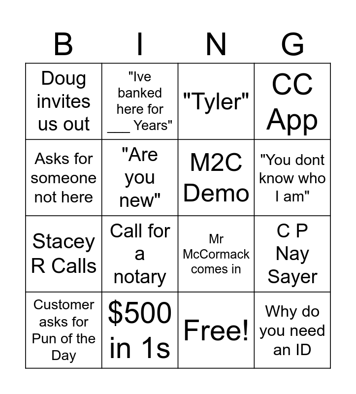This bingo card has 17 words: Free!, Customer asks for Pun of the Day, "Tyler", Doug invites us out, Call for a notary, CC App, C P Nay Sayer, M2C Demo, "You dont know who I am", "Are you new", $500 in 1s, Mr McCormack comes in, Asks for someone not here, "Ive banked here for ___ Years", Stacey R Calls, Lolipop Flavor Q and Why do you need an ID.