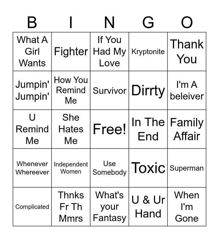 This bingo card has a free space and 79 words: Disco inferno, Baby One More Time, If You Had My Love, I Want It That Way, Smooth, Bailamos, Fly Away, Summer Girls, Jumper, Jumper, Higher, Thong Song, Kryptonite, What A Girl Wants, Music, Jumpin' Jumpin', Oops I Did It Again, Independent Women, Fallin', Family Affair, Drops Of Jupiter, Thank You, U Remind Me, Survivor, How You Remind Me, It's Been Awhile, I'm like A Bird, Bootylicious, Ride Wit Me, EI, I'm A beleiver, Follow Me, What's your Fantasy, A Thousand Miles, Complicated, In The End, Here Without You, Miss Independent, Rock Your Body, When I'm Gone, Shake Ya Tailfeather, Unwell, Cry me A River, Harder To Breathe, It's My Life, Fighter, Ignition, Work it, Right There, The Boys Of Summer, Superman, She Hates Me, Toxic, Since U been Gone, Sk8er Boi, Womanizer, Get Lucky, 1.2, Step, It's Gonna Be Me, Use Somebody, Dirrty, Get The Party Started, Crazy, Bump Bump Bump, The Way you Move, Get Busy, Snap Yo Fingers, Cupid Shuffle, Damaged, Whenever Whereever, Thnks Fr Th Mmrs, Party Like A Rockstar, The Sweet Escape, Cyclone, Kiss Kiss, U & Ur Hand, Lovegame, 3 and Naughty Girl.