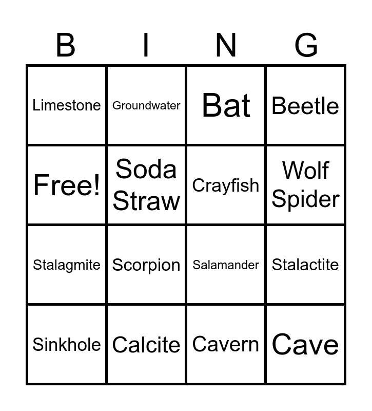This bingo card has 16 words: Calcite, Stalactite, Bat, Limestone, Stalagmite, Groundwater, Salamander, Cavern, Free!, Soda Straw, Sinkhole, Beetle, Scorpion, Wolf Spider, Crayfish and Cave.