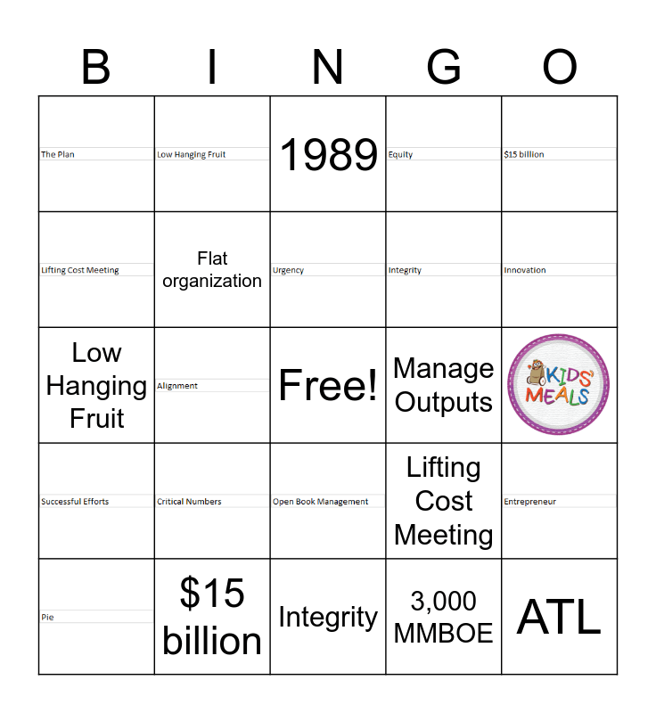 This bingo card has 36 images, a free space and 27 words: Up and to the Right, 3,000 MMBOE, Entrepreneur, Flat organization, Low Hanging Fruit, Manage Outputs, Urgency, Open Book Management, ATL, $15 billion, Vision, Lifting Cost Meeting, Alignment, The Plan, PDP, PNP and PUD, Integrity, Critical Numbers, Successful Efforts, Equity, 1989, Kitchen in the Houston Office, 60%, Ownership, Culture, NB275, Innovation and Pie.
