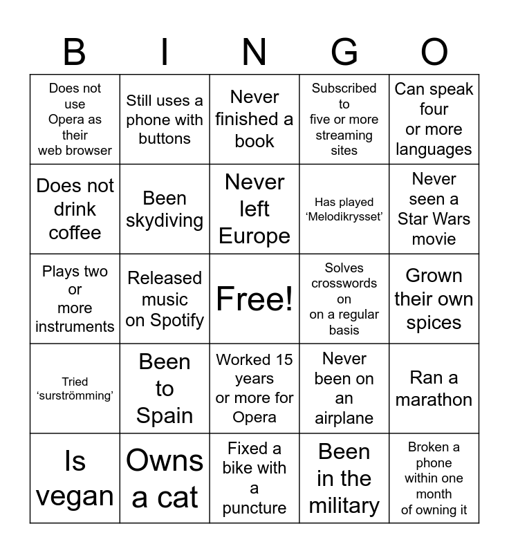 This bingo card has a free space and 24 words: Been to Spain, Owns a cat, Never left Europe, Is vegan, Can speak four or more languages, Does not use Opera as their web browser, Does not drink coffee, Still uses a phone with buttons, Solves crosswords on on a regular basis, Worked 15 years or more for Opera, Has played ‘Melodikrysset’, Plays two or more instruments, Never been on an airplane, Ran a marathon, Been skydiving, Been in the military, Grown their own spices, Never finished a book, Never seen a Star Wars movie, Released music on Spotify, Broken a phone within one month of owning it, Tried ‘surströmming’, Subscribed to five or more streaming sites and Fixed a bike with a puncture.
