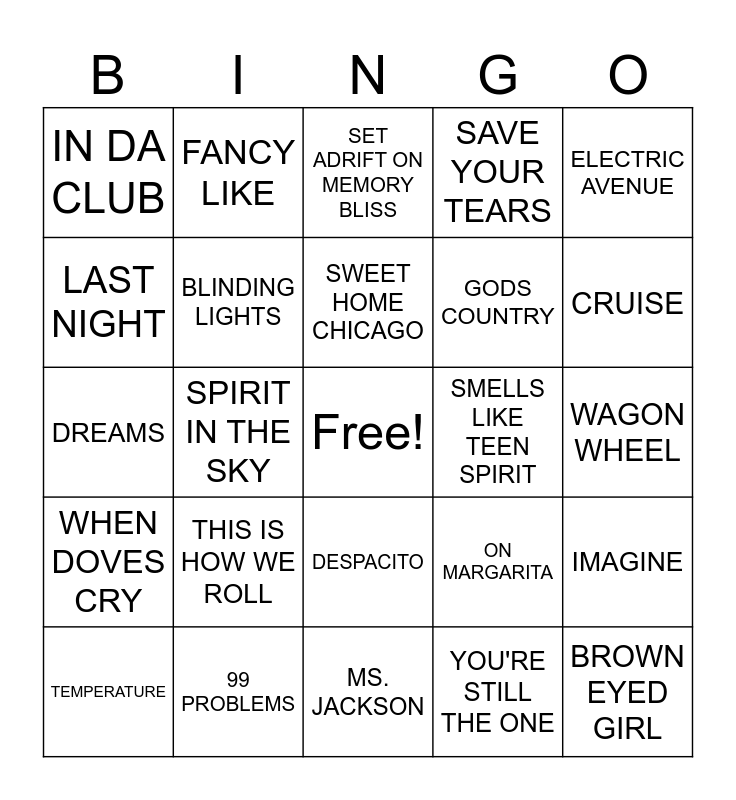 This bingo card has a free space and 75 words: RAPPERS DELIGHT, ROYALS, SET ADRIFT ON MEMORY BLISS, HARLEM SHAKE, BECAUSE I GOT HIGH, GANGNAM STYLE, THIS IS WHY I'M HOT, THONG SONG, TURN DOWN FOR WHAT, IT WASN'T ME, CLINT EASTWOOD, JUST A FRIEND, SWEET HOME CHICAGO, LAST NIGHT, BUY U A DRANK, SPIRIT IN THE SKY, HERE COMES THE SUN, BROWN EYED GIRL, SEE YOU AGAIN, ELECTRIC AVENUE, DON'T STOP BELIEVIN, DREAMS, BLINDING LIGHTS, FANCY LIKE, SAVE YOUR TEARS, WATERMELON SUGAR, THINKING OUT LOUD, STAY WITH ME, MY PREROGATIVE, CRY ME A RIVER, THE REAL SLIM SHADY, THE GAMBLER, MIDNIGHT TRAIN TO GEORGIA, ON MARGARITA, CRUISE, GODS COUNTRY, PIANO MAN, TOES, WAGON WHEEL, YOU'RE STILL THE ONE, ALL SUMMER LONG, LETS STAY TOGETHER, BLURRED LINES, FRIENDS IN LOW PLACES, EASY, ISLANDS IN THE STREAM, TEMPERATURE, IN DA CLUB, KEEP ON LOV'IN YOU, COUNTRY GRAMMER, THE TIME, DESPACITO, CAKE BY THE OCEAN, TENNESSEE WHISKY, BEAUTIFUL CRAZY, LET IT WHIP, SWEET EMOTION, YOU SHOOK ME ALL NIGHT LONG, NEON MOON, COUNTRY GIRL, THIS IS HOW WE ROLL, POKER FACE, GIRL ON FIRE, MY GIRL, RESPECT, SMELLS LIKE TEEN SPIRIT, GOOD VIBRATIONS, JOHNNY B GOOD, STAIRWAY TO HEAVEN, IMAGINE, WHEN DOVES CRY, 99 PROBLEMS, ON THE ROAD AGAIN, MS. JACKSON and IT TAKES TWO.
