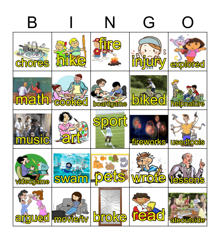 This bingo card has 24 images, a free space and 24 words: swam, movie/tv, boardgame, argued, explored, chores, math, hike, fireworks, pets, biked, music, wrote, lessons, cooked, read, usedtools, fire, helpnature, art, ateoutside, videogame, injury and broke.