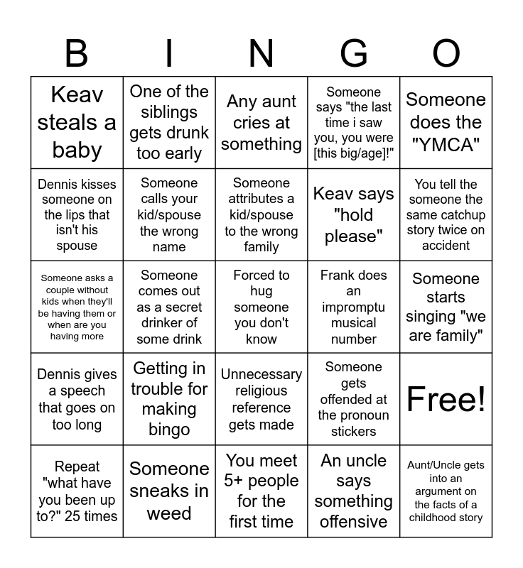This bingo card has 28 words: Free!, Keav says "timeout", Keav says "hold please", An uncle says something offensive, Dennis kisses someone on the lips that isn't his spouse, Any aunt cries at something, One of the siblings gets drunk too early, Dennis gives a speech that goes on too long, Frank does an impromptu musical number, Repeat "what have you been up to?" 25 times, Someone asks a couple without kids when they'll be having them or when are you having more, Someone says "the last time i saw you, you were [this big/age]!", Someone sneaks in weed, You meet 5+ people for the first time, You tell the someone the same catchup story twice on accident, Someone wears matching outfits unrelated to the reunion shirt, Getting in trouble for making bingo, Someone calls your kid/spouse the wrong name, Someone attributes a kid/spouse to the wrong family, Unnecessary religious reference gets made, Keav steals a baby, Aunt/Uncle gets into an argument on the facts of a childhood story, Forced to hug someone you don't know, Someone comes out as a secret drinker of some drink, Someone starts singing "we are family", Someone gets offended at the pronoun stickers, Someone does the "YMCA" and Someone spells your name incorrectly.
