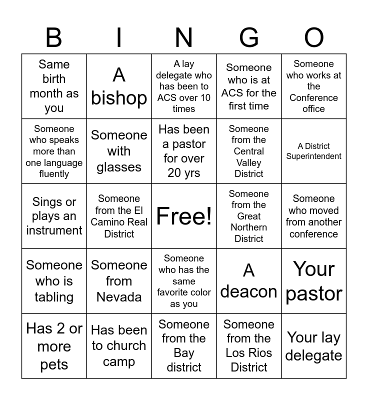 This bingo card has a free space and 24 words: Someone from Nevada, Has been to church camp, Has been a pastor for over 20 yrs, Has 2 or more pets, Someone who works at the Conference office, Same birth month as you, Someone who speaks more than one language fluently, A bishop, Someone from the Great Northern District, Someone who has the same favorite color as you, Someone from the Central Valley District, Sings or plays an instrument, A deacon, Your pastor, Someone with glasses, Someone from the Los Rios District, Someone who moved from another conference, A lay delegate who has been to ACS over 10 times, A District Superintendent, Someone from the El Camino Real District, Your lay delegate, Someone who is tabling, Someone who is at ACS for the first time and Someone from the Bay district.