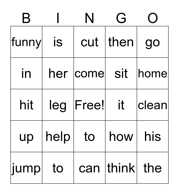 This bingo card has a free space and 25 words: help, can, come, jump, go, funny, in, is, it, to, sit, hit, how, his, her, carry, clean, cut, home, leg, the, to, up, then and think.