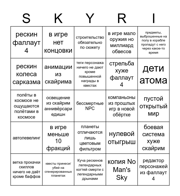 This bingo card has a free space and 24 words: в игре меньше 10 фракций, квесты принеси/убей на сгенерированных планетах, теги персонажа ничего не дают кроме повышенной награды в квестах, ветка прокачки скиллов ничего не даёт кроме баффов, предметы, выброшенные на полу в корабле пропадут с него через какое-то время, рескин фаллаут 4, рескин колеса сарказма, в игре нет концовки, компаньоны из прошлых игр в новой обёртке, планеты отличаются лишь цветовым фильтром, стрельба хуже фаллаут 4, полёты в космосе не ощущаются полётами в космосе, нулевой отыгрыш, боевая система хуже скайрим, анимации из скайрима, копия No Man's Sky, пустой открытый мир, строительство обязательно по сюжету, дети атома, освещение из скайрим аннивёрсари едишн, редактор персонажей из фаллаут 4, автолевелинг, в игре мало оружия но миллиард обвесов and Куча рескинов легендарных когтей смерти с легендарными дрынами.