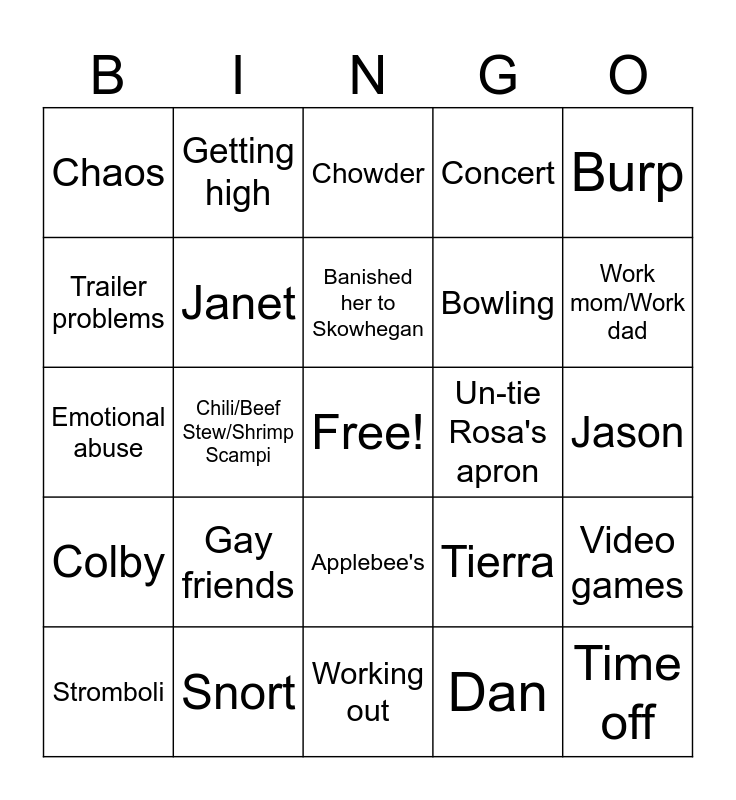 This bingo card has a free space and 24 words: Gay friends, Snort, Banished her to Skowhegan, Stromboli, Burp, Chaos, Trailer problems, Getting high, Un-tie Rosa's apron, Applebee's, Bowling, Emotional abuse, Tierra, Video games, Janet, Dan, Jason, Chowder, Work mom/Work dad, Chili/Beef Stew/Shrimp Scampi, Time off, Colby, Concert and Working out.