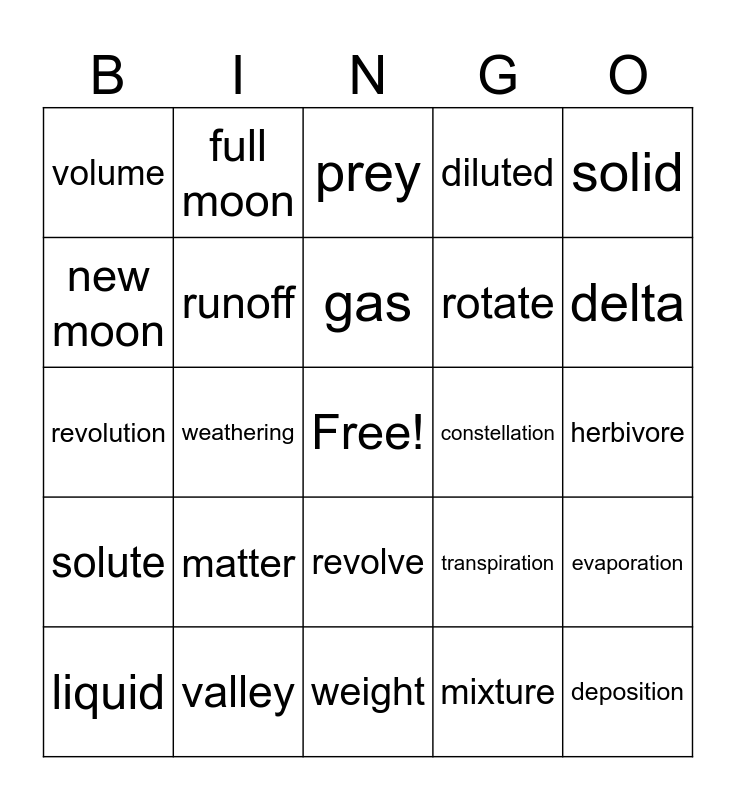 This bingo card has a free space and 25 words: matter, weight, gas, liquid, solid, volume, new moon, full moon, constellation, revolve, rotate, revolution, transpiration, evaporation, runoff, omnivore, herbivore, prey, delta, weathering, deposition, valley, solute, diluted and mixture.