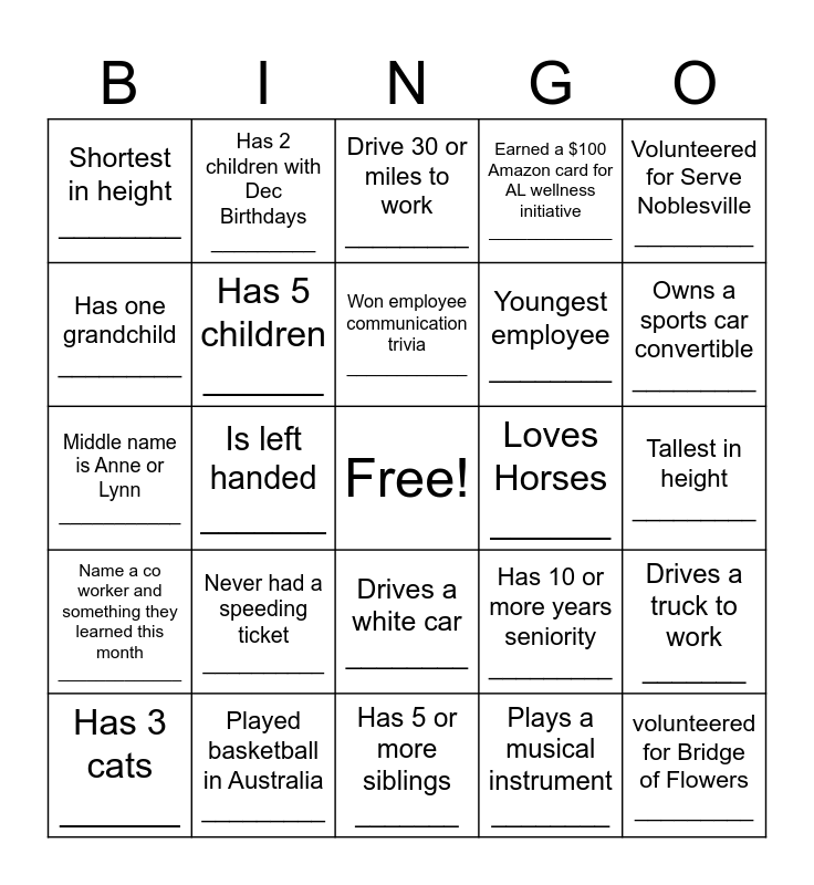 This bingo card has a free space and 24 words: Never had a speeding ticket __________, Played basketball in Australia _________, Won employee communication trivia ____________, Has 3 cats ______, Volunteered for Serve Noblesville _________, Shortest in height ________, Has one grandchild _________, Has 2 children with Dec Birthdays _________, Loves Horses ______, Drives a white car ________, Youngest employee ________, Middle name is Anne or Lynn ___________, Has 10 or more years seniority _________, Drives a truck to work _______, Has 5 children ______, Plays a musical instrument ________, Tallest in height _________, Drive 30 or miles to work _________, Owns a sports car convertible _________, Is left handed _______, volunteered for Bridge of Flowers _________, Name a co worker and something they learned this month _____________, Earned a $100 Amazon card for AL wellness initiative _____________ and Has 5 or more siblings _______.