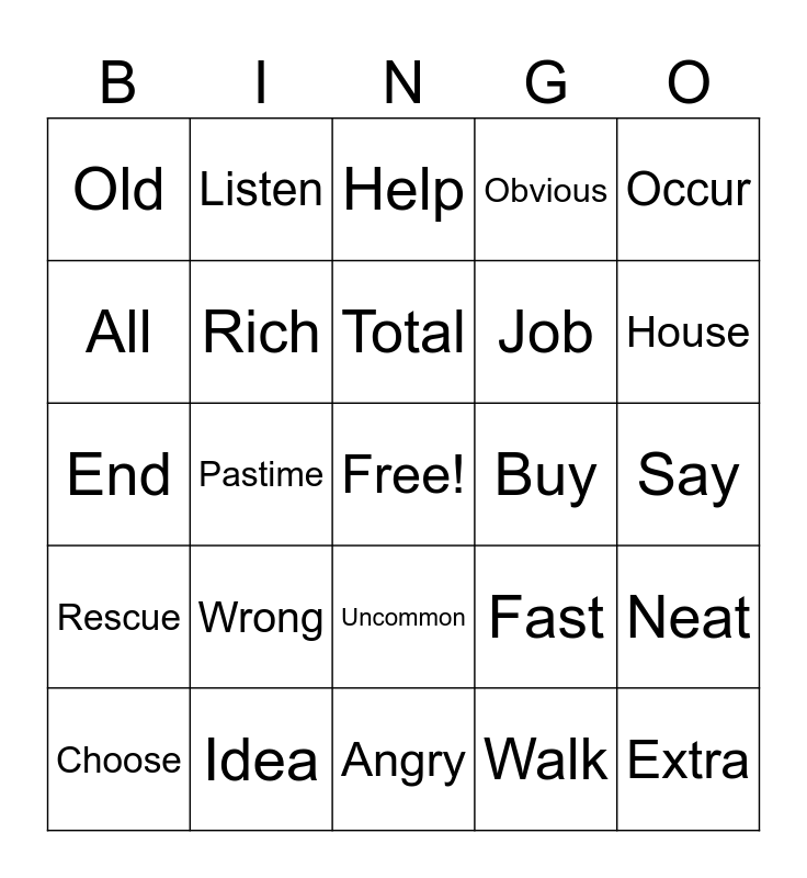 This bingo card has a free space and 24 words: Wrong, Idea, Total, Choose, Occur, Old, All, Listen, Buy, Uncommon, Job, End, Fast, Neat, Rich, Walk, Say, Help, House, Pastime, Extra, Rescue, Obvious and Angry.