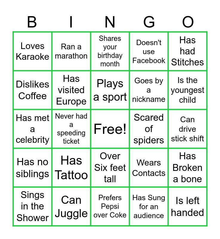 This bingo card has a free space and 24 words: Has Tattoo, Can Juggle, Plays a sport, Sings in the Shower, Has had Stitches, Loves Karaoke, Dislikes Coffee, Ran a marathon, Scared of spiders, Over Six feet tall, Goes by a nickname, Has met a celebrity, Wears Contacts, Has Broken a bone, Has visited Europe, Has Sung for an audience, Can drive stick shift, Shares your birthday month, Is the youngest child, Never had a speeding ticket, Is left handed, Has no siblings, Doesn't use Facebook and Prefers Pepsi over Coke.