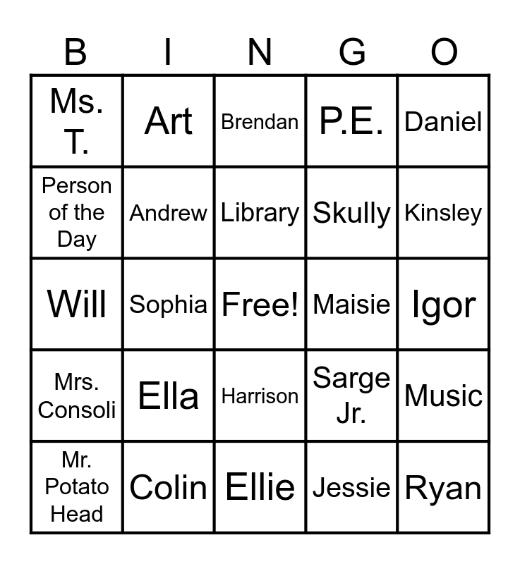 This bingo card has a free space and 29 words: Mr. Potato Head, Lily, Sophia, Guntaj, Ms. T., Brendan, Andrew, Ella, Maisie, Colin, Igor, Ryan, Ellie, Jessie, Kinsley, Elliott, Harrison, Mrs. Consoli, Daniel, Will, Sarge Jr., Eggbert, Skully, Person of the Day, P.E., Art, Music, Library and Computer.