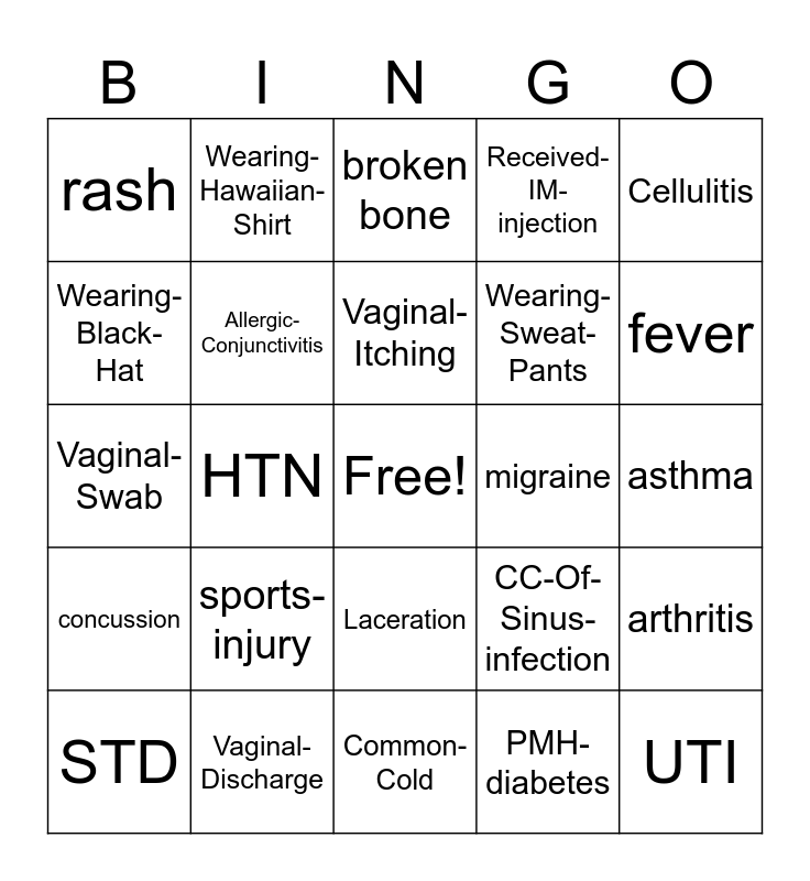 This bingo card has a free space and 31 words: Common-Cold, sprained-ankle, HTN, sore-throat, rash, broken bone, Allergic-Conjunctivitis, CC-Of-Sinus-infection, migraine, PMH-diabetes, asthma, UTI, anxiety, backache, fever, cough, arthritis, sports-injury, concussion, Laceration, Cellulitis, Tick-Bite, STD, Wearing-Hawaiian-Shirt, Wearing-Sweat-Pants, Wearing-Black-Hat, Received-IM-injection, Vaginal-Swab, Vaginal-Discharge, Vaginal-Itching and Urethral-Discharge.