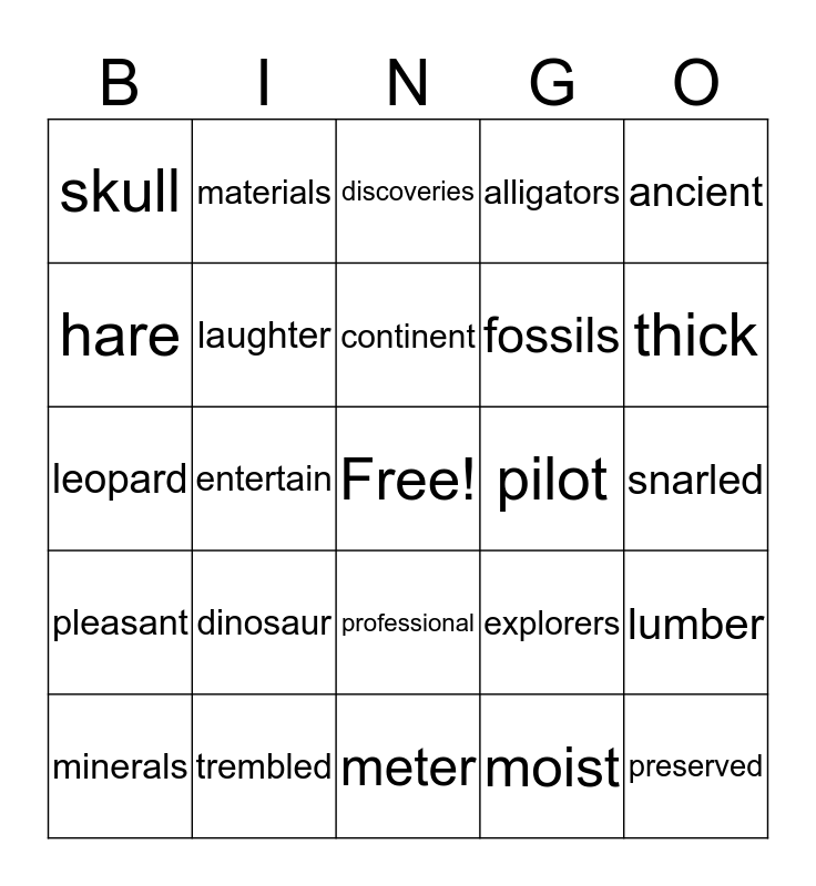 This bingo card has a free space and 24 words: dinosaur, trembled, continent, minerals, ancient, skull, hare, materials, pilot, professional, fossils, leopard, explorers, lumber, laughter, moist, snarled, discoveries, thick, entertain, preserved, pleasant, alligators and meter.