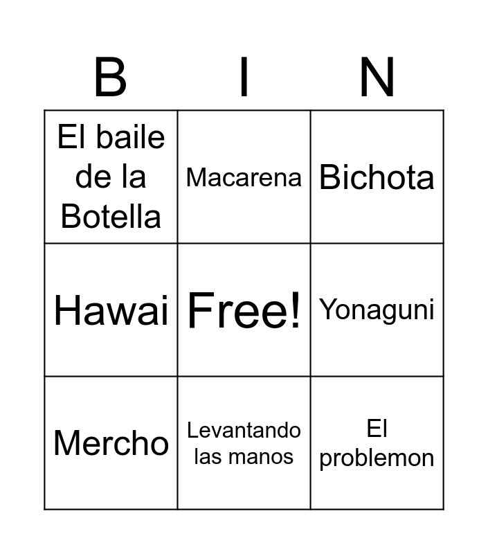 This bingo card has a free space and 19 words: Mercho, La curiosidad, Yonaguni, Meneadito, Tacones rojos, El problemon, Gasolina, Macarena, Bichota, Hawai, Chica ideal, Las avispas, El baile de la Botella, Mayonesa, El baile del gorila, Mayores, Levantando las manos, El gato volador and Despacito.
