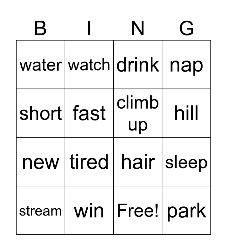 This bingo card has 17 words: Free!, stream, drink, water, tired, nap, sleep, climb up, hill, fast, win, hair, short, watch, new, black and park.