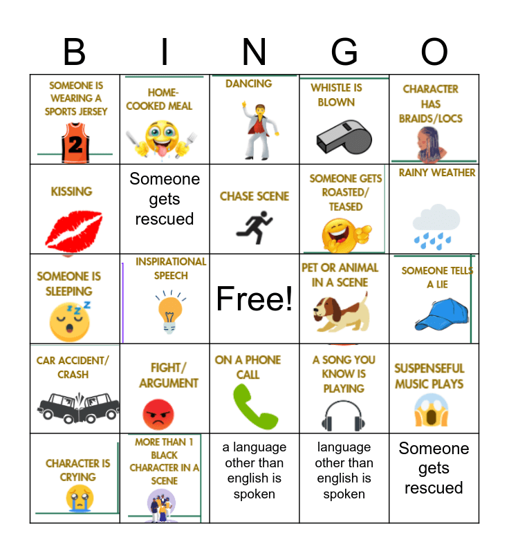 This bingo card has 20 images, a free space and 4 words: Someone gets rescued, language other than english is spoken, Someone gets rescued and a language other than english is spoken.