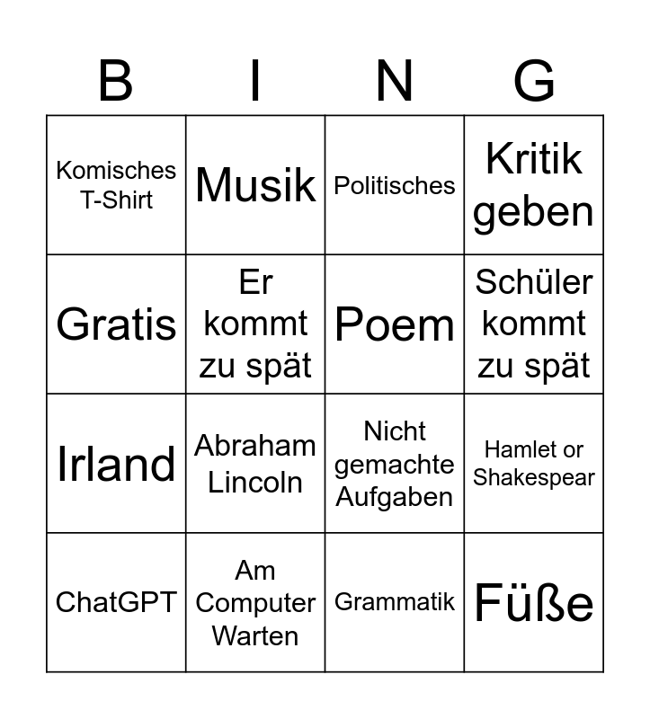 This bingo card has 16 words: Am Computer Warten, Hamlet or Shakespear, Politisches, Komisches T-Shirt, Irland, Musik, Nicht gemachte Aufgaben, Grammatik, Gratis, Er kommt zu spät, ChatGPT, Kritik geben, Abraham Lincoln, Schüler kommt zu spät, Poem and Füße.