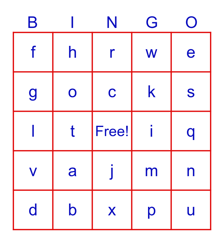 This bingo card has a free space and 24 words: a, b, c, d, e, f, g, h, i, j, k, l, m, n, o, p, q, r, s, t, u, v, w and x.