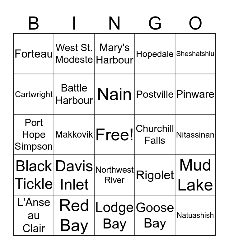 This bingo card has a free space and 24 words: Davis Inlet, Red Bay, Nain, L'Anse au Clair, Sheshatshiu, Forteau, Cartwright, West St. Modeste, Churchill Falls, Northwest River, Postville, Port Hope Simpson, Rigolet, Mud Lake, Battle Harbour, Goose Bay, Nitassinan, Mary's Harbour, Pinware, Makkovik, Natuashish, Black Tickle, Hopedale and Lodge Bay.
