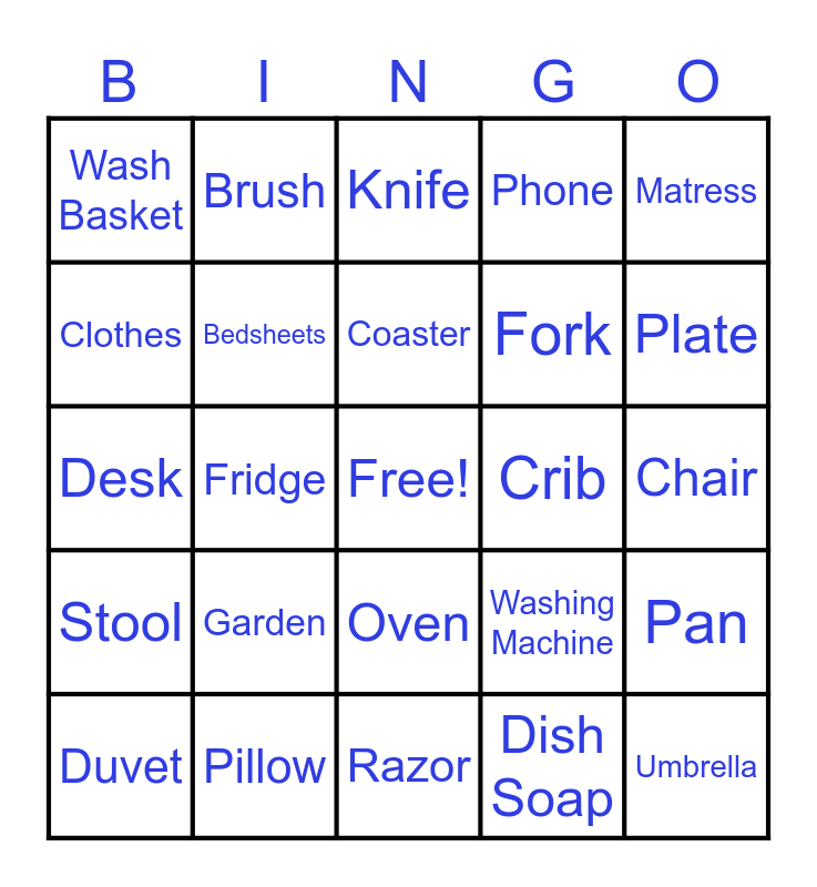 This bingo card has a free space and 24 words: Garden, Pillow, Coaster, Duvet, Matress, Wash Basket, Clothes, Brush, Crib, Oven, Fork, Desk, Washing Machine, Pan, Bedsheets, Dish Soap, Chair, Knife, Plate, Fridge, Umbrella, Stool, Phone and Razor.