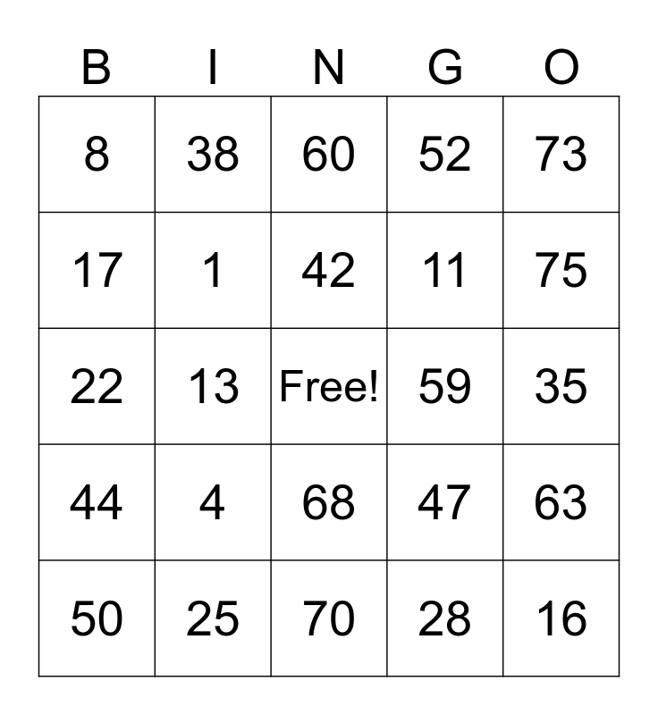 This bingo card has a free space and 24 words: 4, 25, 42, 50, 73, 8, 17, 38, 59, 68, 11, 22, 47, 63, 1, 28, 35, 60, 75, 13, 16, 44, 52 and 70.