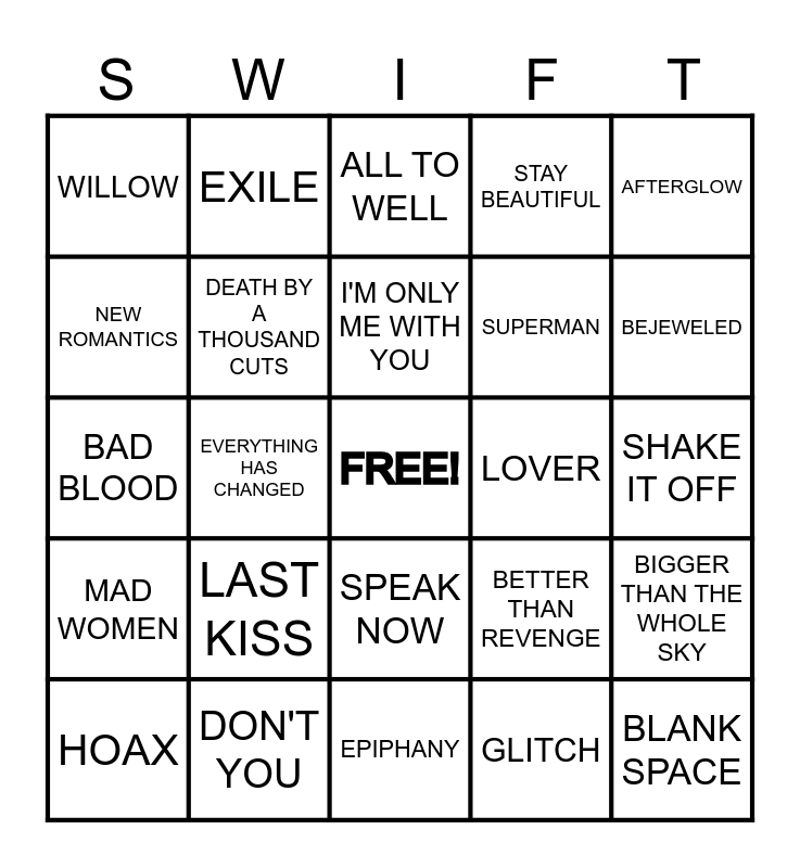 This bingo card has a free space and 24 words: LAST KISS, DON'T YOU, I'M ONLY ME WITH YOU, HOAX, AFTERGLOW, WILLOW, NEW ROMANTICS, EXILE, LOVER, SPEAK NOW, SUPERMAN, BAD BLOOD, BETTER THAN REVENGE, BIGGER THAN THE WHOLE SKY, DEATH BY A THOUSAND CUTS, GLITCH, SHAKE IT OFF, ALL TO WELL, BEJEWELED, EVERYTHING HAS CHANGED, BLANK SPACE, MAD WOMEN, STAY BEAUTIFUL and EPIPHANY.