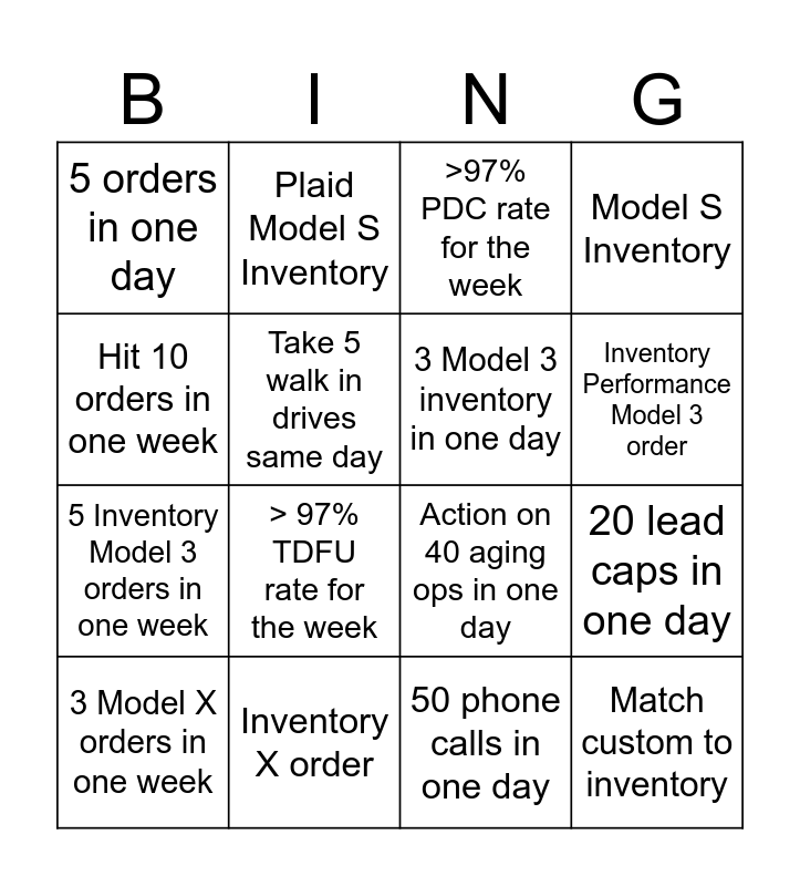 This bingo card has 16 words: Inventory X order, 20 lead caps in one day, >97% PDC rate for the week, 5 orders in one day, 5 Inventory Model 3 orders in one week, Plaid Model S Inventory, Action on 40 aging ops in one day, 50 phone calls in one day, Hit 10 orders in one week, Take 5 walk in drives same day, 3 Model X orders in one week, Model S Inventory, > 97% TDFU rate for the week, Inventory Performance Model 3 order, 3 Model 3 inventory in one day and Match custom to inventory.